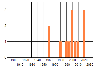 Het aantal atlasblokken (5x5 km) waarin de soort is gemeld binnen een periode van vijf jaar (vanaf 1980) of twintig jaar. Niet gecorrigeerd voor waarnemersinspanning en het aantal doorgegeven waarnemingen kan sterk variëren per periode, dus een trend in verspreiding kan hier niet direct uit worden afgelezen. Het opgegeven jaartal is het eerste jaar van de periode. Bron: gevalideerde waarnemingen uit de NDFF.