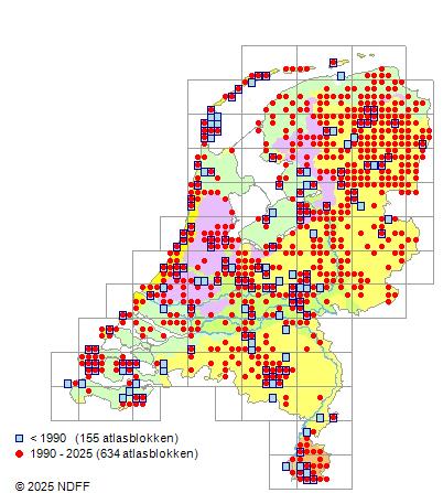Het aantal atlasblokken (5x5 km) waarin de soort is gemeld binnen een periode van vijf jaar (vanaf 1980) of twintig jaar. Niet gecorrigeerd voor waarnemersinspanning en het aantal doorgegeven waarnemingen kan sterk variëren per periode, dus een trend in verspreiding kan hier niet direct uit worden afgelezen. Het opgegeven jaartal is het eerste jaar van de periode. Bron: gevalideerde waarnemingen uit de NDFF.