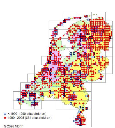 Het aantal atlasblokken (5x5 km) waarin de soort is gemeld binnen een periode van vijf jaar (vanaf 1980) of twintig jaar. Niet gecorrigeerd voor waarnemersinspanning en het aantal doorgegeven waarnemingen kan sterk variëren per periode, dus een trend in verspreiding kan hier niet direct uit worden afgelezen. Het opgegeven jaartal is het eerste jaar van de periode. Bron: gevalideerde waarnemingen uit de NDFF.