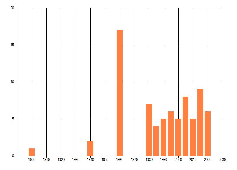 Het aantal atlasblokken (5x5 km) waarin de soort is gemeld binnen een periode van vijf jaar (vanaf 1980) of twintig jaar. Niet gecorrigeerd voor waarnemersinspanning en het aantal doorgegeven waarnemingen kan sterk variëren per periode, dus een trend in verspreiding kan hier niet direct uit worden afgelezen. Het opgegeven jaartal is het eerste jaar van de periode. Bron: gevalideerde waarnemingen uit de NDFF.