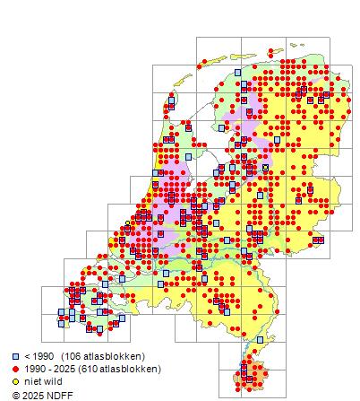 Het aantal atlasblokken (5x5 km) waarin de soort is gemeld binnen een periode van vijf jaar (vanaf 1980) of twintig jaar. Niet gecorrigeerd voor waarnemersinspanning en het aantal doorgegeven waarnemingen kan sterk variëren per periode, dus een trend in verspreiding kan hier niet direct uit worden afgelezen. Het opgegeven jaartal is het eerste jaar van de periode. Bron: gevalideerde waarnemingen uit de NDFF.