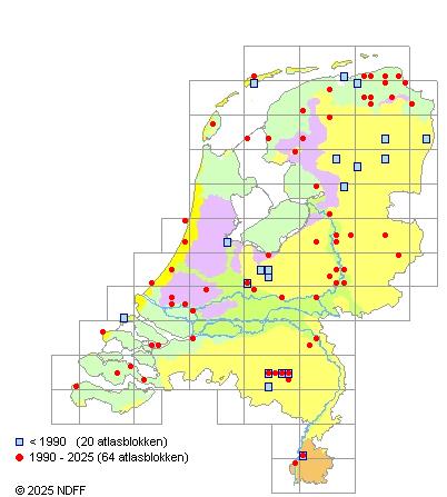 Het aantal atlasblokken (5x5 km) waarin de soort is gemeld binnen een periode van vijf jaar (vanaf 1980) of twintig jaar. Niet gecorrigeerd voor waarnemersinspanning en het aantal doorgegeven waarnemingen kan sterk variëren per periode, dus een trend in verspreiding kan hier niet direct uit worden afgelezen. Het opgegeven jaartal is het eerste jaar van de periode. Bron: gevalideerde waarnemingen uit de NDFF.