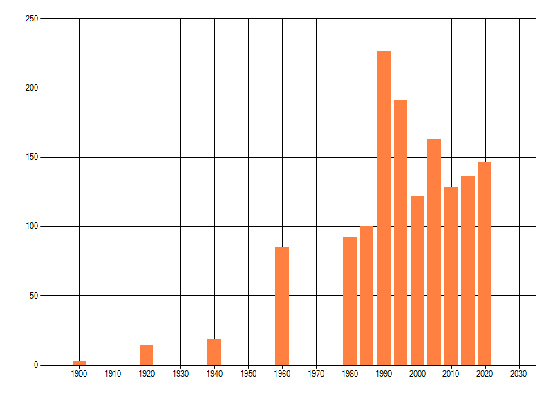 Het aantal atlasblokken (5x5 km) waarin de soort is gemeld binnen een periode van vijf jaar (vanaf 1980) of twintig jaar. Niet gecorrigeerd voor waarnemersinspanning en het aantal doorgegeven waarnemingen kan sterk variëren per periode, dus een trend in verspreiding kan hier niet direct uit worden afgelezen. Het opgegeven jaartal is het eerste jaar van de periode. Bron: gevalideerde waarnemingen uit de NDFF.