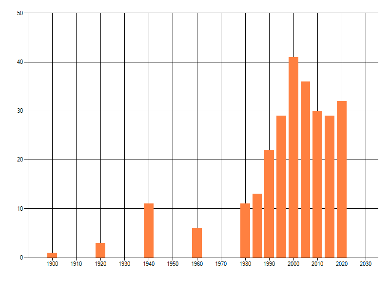 Het aantal atlasblokken (5x5 km) waarin de soort is gemeld binnen een periode van vijf jaar (vanaf 1980) of twintig jaar. Niet gecorrigeerd voor waarnemersinspanning en het aantal doorgegeven waarnemingen kan sterk variëren per periode, dus een trend in verspreiding kan hier niet direct uit worden afgelezen. Het opgegeven jaartal is het eerste jaar van de periode. Bron: gevalideerde waarnemingen uit de NDFF.