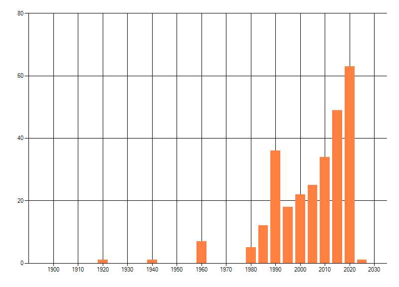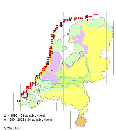 Het aantal atlasblokken (5x5 km) waarin de soort is gemeld binnen een periode van vijf jaar (vanaf 1980) of twintig jaar. Niet gecorrigeerd voor waarnemersinspanning en het aantal doorgegeven waarnemingen kan sterk variëren per periode, dus een trend in verspreiding kan hier niet direct uit worden afgelezen. Het opgegeven jaartal is het eerste jaar van de periode. Bron: gevalideerde waarnemingen uit de NDFF.