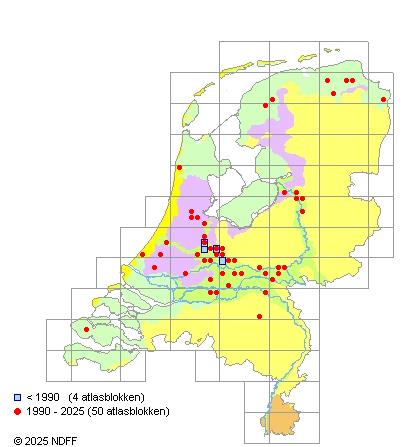 Het aantal atlasblokken (5x5 km) waarin de soort is gemeld binnen een periode van vijf jaar (vanaf 1980) of twintig jaar. Niet gecorrigeerd voor waarnemersinspanning en het aantal doorgegeven waarnemingen kan sterk variëren per periode, dus een trend in verspreiding kan hier niet direct uit worden afgelezen. Het opgegeven jaartal is het eerste jaar van de periode. Bron: gevalideerde waarnemingen uit de NDFF.