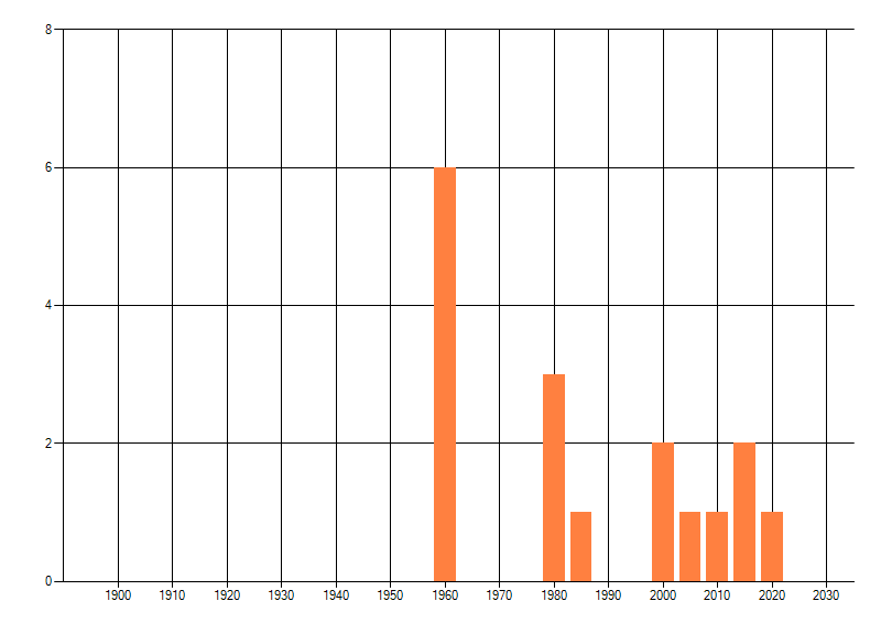 Het aantal atlasblokken (5x5 km) waarin de soort is gemeld binnen een periode van vijf jaar (vanaf 1980) of twintig jaar. Niet gecorrigeerd voor waarnemersinspanning en het aantal doorgegeven waarnemingen kan sterk variëren per periode, dus een trend in verspreiding kan hier niet direct uit worden afgelezen. Het opgegeven jaartal is het eerste jaar van de periode. Bron: gevalideerde waarnemingen uit de NDFF.