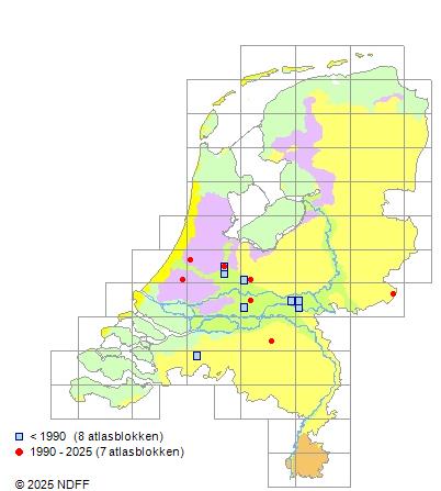 Zeer zeld. in F (Breukelen, Nijenrode; Zeist, Wulperhorst; Zetten, Hemmen; Beesd, Mariënwaard; Valburg, Loenen). Sinds 1986 nog slechts één keer vermeld, vermoedelijk achteruitgaand.
