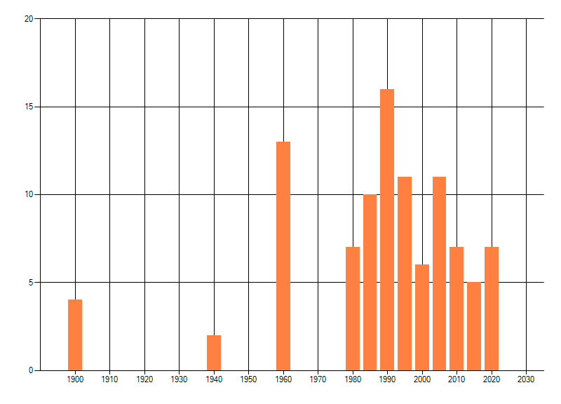 Het aantal atlasblokken (5x5 km) waarin de soort is gemeld binnen een periode van vijf jaar (vanaf 1980) of twintig jaar. Niet gecorrigeerd voor waarnemersinspanning en het aantal doorgegeven waarnemingen kan sterk variëren per periode, dus een trend in verspreiding kan hier niet direct uit worden afgelezen. Het opgegeven jaartal is het eerste jaar van de periode. Bron: gevalideerde waarnemingen uit de NDFF.