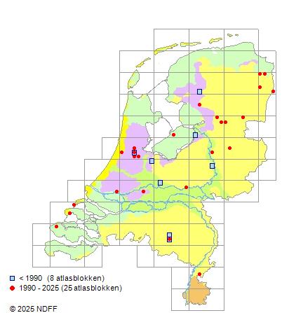 Het aantal atlasblokken (5x5 km) waarin de soort is gemeld binnen een periode van vijf jaar (vanaf 1980) of twintig jaar. Niet gecorrigeerd voor waarnemersinspanning en het aantal doorgegeven waarnemingen kan sterk variëren per periode, dus een trend in verspreiding kan hier niet direct uit worden afgelezen. Het opgegeven jaartal is het eerste jaar van de periode. Bron: gevalideerde waarnemingen uit de NDFF.