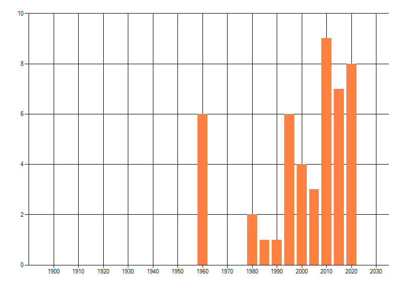 Het aantal atlasblokken (5x5 km) waarin de soort is gemeld binnen een periode van vijf jaar (vanaf 1980) of twintig jaar. Niet gecorrigeerd voor waarnemersinspanning en het aantal doorgegeven waarnemingen kan sterk variëren per periode, dus een trend in verspreiding kan hier niet direct uit worden afgelezen. Het opgegeven jaartal is het eerste jaar van de periode. Bron: gevalideerde waarnemingen uit de NDFF.
