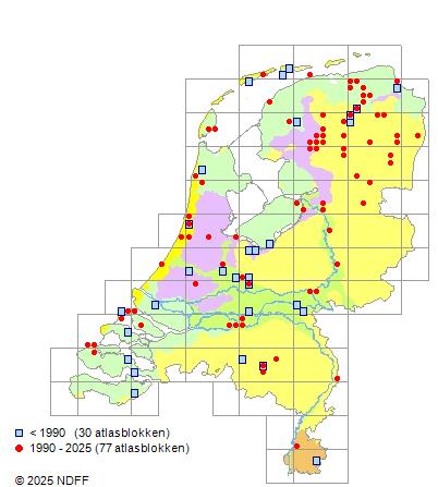 Het aantal atlasblokken (5x5 km) waarin de soort is gemeld binnen een periode van vijf jaar (vanaf 1980) of twintig jaar. Niet gecorrigeerd voor waarnemersinspanning en het aantal doorgegeven waarnemingen kan sterk variëren per periode, dus een trend in verspreiding kan hier niet direct uit worden afgelezen. Het opgegeven jaartal is het eerste jaar van de periode. Bron: gevalideerde waarnemingen uit de NDFF.