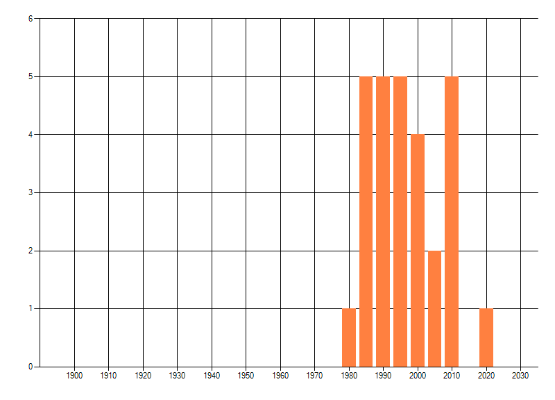 Het aantal atlasblokken (5x5 km) waarin de soort is gemeld binnen een periode van vijf jaar (vanaf 1980) of twintig jaar. Niet gecorrigeerd voor waarnemersinspanning en het aantal doorgegeven waarnemingen kan sterk variëren per periode, dus een trend in verspreiding kan hier niet direct uit worden afgelezen. Het opgegeven jaartal is het eerste jaar van de periode. Bron: gevalideerde waarnemingen uit de NDFF.