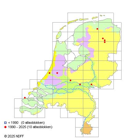 Het aantal atlasblokken (5x5 km) waarin de soort is gemeld binnen een periode van vijf jaar (vanaf 1980) of twintig jaar. Niet gecorrigeerd voor waarnemersinspanning en het aantal doorgegeven waarnemingen kan sterk variëren per periode, dus een trend in verspreiding kan hier niet direct uit worden afgelezen. Het opgegeven jaartal is het eerste jaar van de periode. Bron: gevalideerde waarnemingen uit de NDFF.