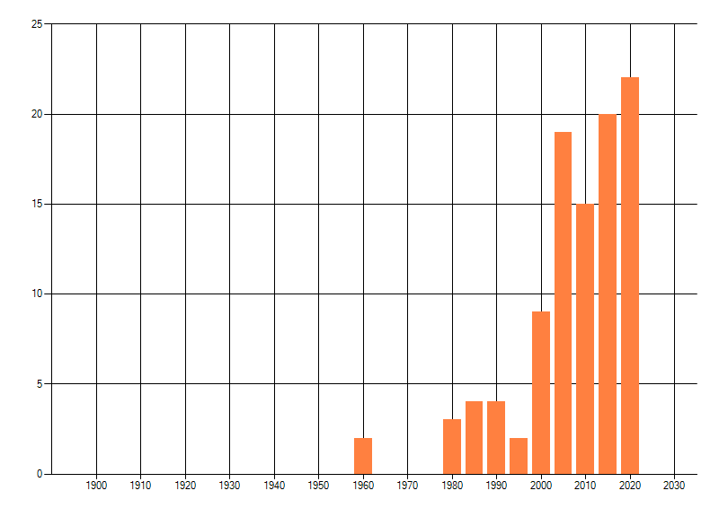 Het aantal atlasblokken (5x5 km) waarin de soort is gemeld binnen een periode van vijf jaar (vanaf 1980) of twintig jaar. Niet gecorrigeerd voor waarnemersinspanning en het aantal doorgegeven waarnemingen kan sterk variëren per periode, dus een trend in verspreiding kan hier niet direct uit worden afgelezen. Het opgegeven jaartal is het eerste jaar van de periode. Bron: gevalideerde waarnemingen uit de NDFF.