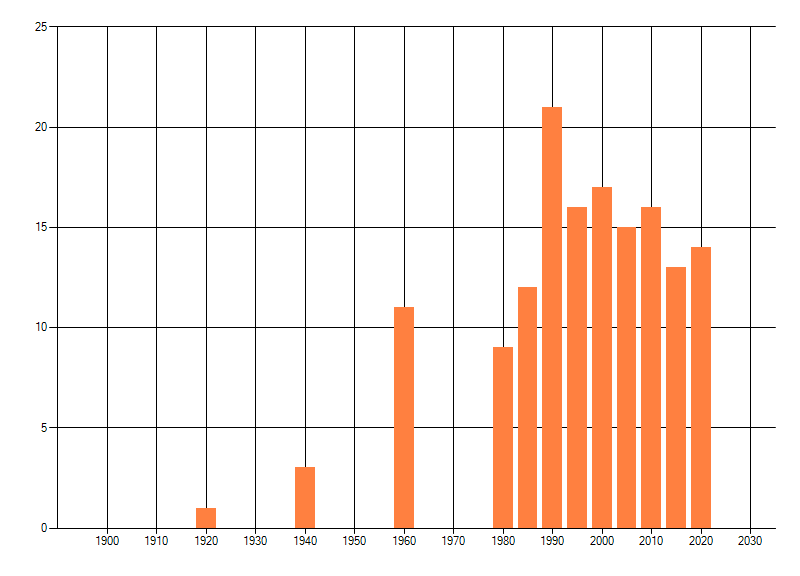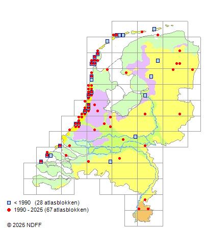 Het aantal atlasblokken (5x5 km) waarin de soort is gemeld binnen een periode van vijf jaar (vanaf 1980) of twintig jaar. Niet gecorrigeerd voor waarnemersinspanning en het aantal doorgegeven waarnemingen kan sterk variëren per periode, dus een trend in verspreiding kan hier niet direct uit worden afgelezen. Het opgegeven jaartal is het eerste jaar van de periode. Bron: gevalideerde waarnemingen uit de NDFF.
