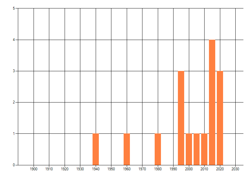 Het aantal atlasblokken (5x5 km) waarin de soort is gemeld binnen een periode van vijf jaar (vanaf 1980) of twintig jaar. Niet gecorrigeerd voor waarnemersinspanning en het aantal doorgegeven waarnemingen kan sterk variëren per periode, dus een trend in verspreiding kan hier niet direct uit worden afgelezen. Het opgegeven jaartal is het eerste jaar van de periode. Bron: gevalideerde waarnemingen uit de NDFF.