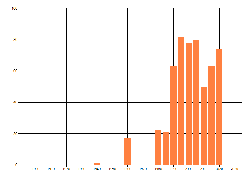 Het aantal atlasblokken (5x5 km) waarin de soort is gemeld binnen een periode van vijf jaar (vanaf 1980) of twintig jaar. Niet gecorrigeerd voor waarnemersinspanning en het aantal doorgegeven waarnemingen kan sterk variëren per periode, dus een trend in verspreiding kan hier niet direct uit worden afgelezen. Het opgegeven jaartal is het eerste jaar van de periode. Bron: gevalideerde waarnemingen uit de NDFF.