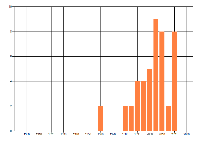 Het aantal atlasblokken (5x5 km) waarin de soort is gemeld binnen een periode van vijf jaar (vanaf 1980) of twintig jaar. Niet gecorrigeerd voor waarnemersinspanning en het aantal doorgegeven waarnemingen kan sterk variëren per periode, dus een trend in verspreiding kan hier niet direct uit worden afgelezen. Het opgegeven jaartal is het eerste jaar van de periode. Bron: gevalideerde waarnemingen uit de NDFF.
