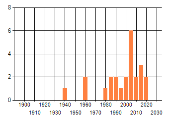 Het aantal atlasblokken (5x5 km) waarin de soort is gemeld binnen een periode van vijf jaar (vanaf 1980) of twintig jaar. Niet gecorrigeerd voor waarnemersinspanning en het aantal doorgegeven waarnemingen kan sterk variëren per periode, dus een trend in verspreiding kan hier niet direct uit worden afgelezen. Het opgegeven jaartal is het eerste jaar van de periode. Bron: gevalideerde waarnemingen uit de NDFF.