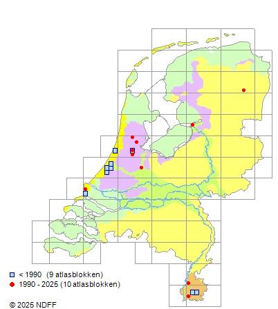 Het aantal atlasblokken (5x5 km) waarin de soort is gemeld binnen een periode van vijf jaar (vanaf 1980) of twintig jaar. Niet gecorrigeerd voor waarnemersinspanning en het aantal doorgegeven waarnemingen kan sterk variëren per periode, dus een trend in verspreiding kan hier niet direct uit worden afgelezen. Het opgegeven jaartal is het eerste jaar van de periode. Bron: gevalideerde waarnemingen uit de NDFF.