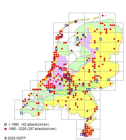 Het aantal atlasblokken (5x5 km) waarin de soort is gemeld binnen een periode van vijf jaar (vanaf 1980) of twintig jaar. Niet gecorrigeerd voor waarnemersinspanning en het aantal doorgegeven waarnemingen kan sterk variëren per periode, dus een trend in verspreiding kan hier niet direct uit worden afgelezen. Het opgegeven jaartal is het eerste jaar van de periode. Bron: gevalideerde waarnemingen uit de NDFF.