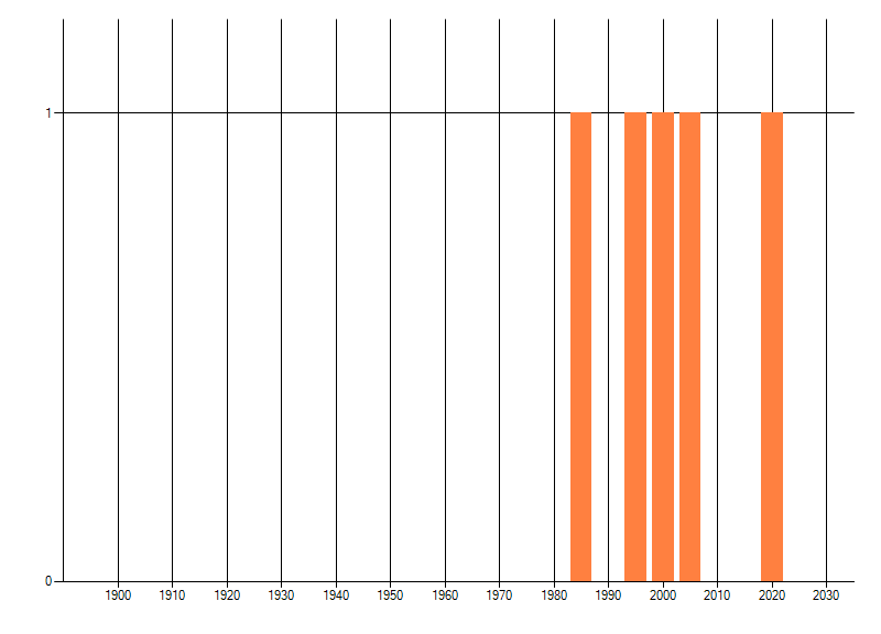 Het aantal atlasblokken (5x5 km) waarin de soort is gemeld binnen een periode van vijf jaar (vanaf 1980) of twintig jaar. Niet gecorrigeerd voor waarnemersinspanning en het aantal doorgegeven waarnemingen kan sterk variëren per periode, dus een trend in verspreiding kan hier niet direct uit worden afgelezen. Het opgegeven jaartal is het eerste jaar van de periode. Bron: gevalideerde waarnemingen uit de NDFF.