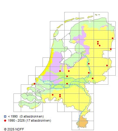Het aantal atlasblokken (5x5 km) waarin de soort is gemeld binnen een periode van vijf jaar (vanaf 1980) of twintig jaar. Niet gecorrigeerd voor waarnemersinspanning en het aantal doorgegeven waarnemingen kan sterk variëren per periode, dus een trend in verspreiding kan hier niet direct uit worden afgelezen. Het opgegeven jaartal is het eerste jaar van de periode. Bron: gevalideerde waarnemingen uit de NDFF.