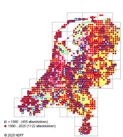 Het aantal atlasblokken (5x5 km) waarin de soort is gemeld binnen een periode van vijf jaar (vanaf 1980) of twintig jaar. Niet gecorrigeerd voor waarnemersinspanning en het aantal doorgegeven waarnemingen kan sterk variëren per periode, dus een trend in verspreiding kan hier niet direct uit worden afgelezen. Het opgegeven jaartal is het eerste jaar van de periode. Bron: gevalideerde waarnemingen uit de NDFF.