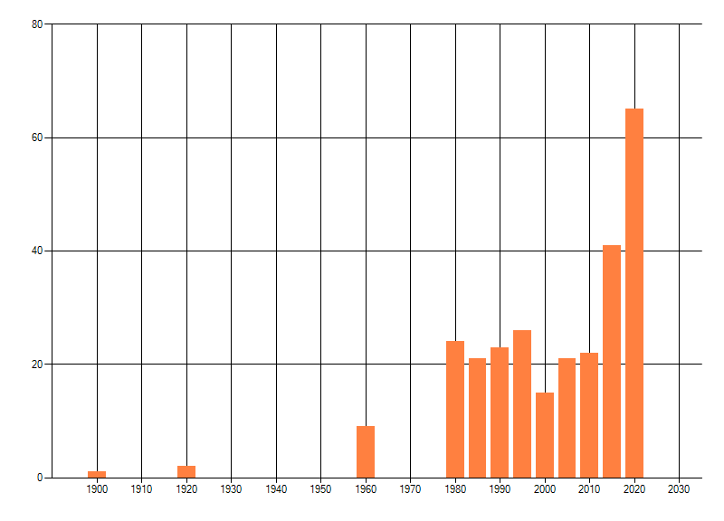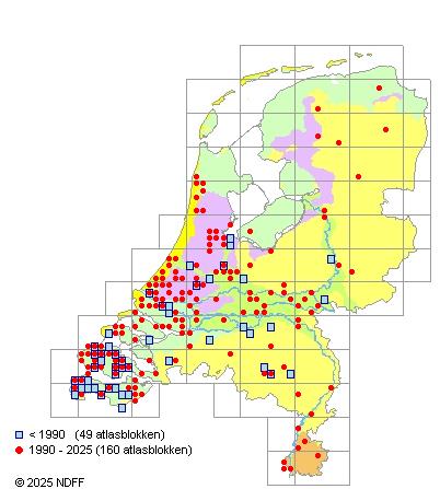Het aantal atlasblokken (5x5 km) waarin de soort is gemeld binnen een periode van vijf jaar (vanaf 1980) of twintig jaar. Niet gecorrigeerd voor waarnemersinspanning en het aantal doorgegeven waarnemingen kan sterk variëren per periode, dus een trend in verspreiding kan hier niet direct uit worden afgelezen. Het opgegeven jaartal is het eerste jaar van de periode. Bron: gevalideerde waarnemingen uit de NDFF.