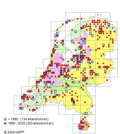 Het aantal atlasblokken (5x5 km) waarin de soort is gemeld binnen een periode van vijf jaar (vanaf 1980) of twintig jaar. Niet gecorrigeerd voor waarnemersinspanning en het aantal doorgegeven waarnemingen kan sterk variëren per periode, dus een trend in verspreiding kan hier niet direct uit worden afgelezen. Het opgegeven jaartal is het eerste jaar van de periode. Bron: gevalideerde waarnemingen uit de NDFF.
