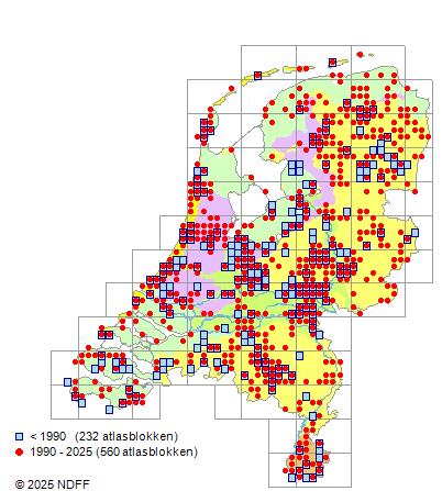 Het aantal atlasblokken (5x5 km) waarin de soort is gemeld binnen een periode van vijf jaar (vanaf 1980) of twintig jaar. Niet gecorrigeerd voor waarnemersinspanning en het aantal doorgegeven waarnemingen kan sterk variëren per periode, dus een trend in verspreiding kan hier niet direct uit worden afgelezen. Het opgegeven jaartal is het eerste jaar van de periode. Bron: gevalideerde waarnemingen uit de NDFF.