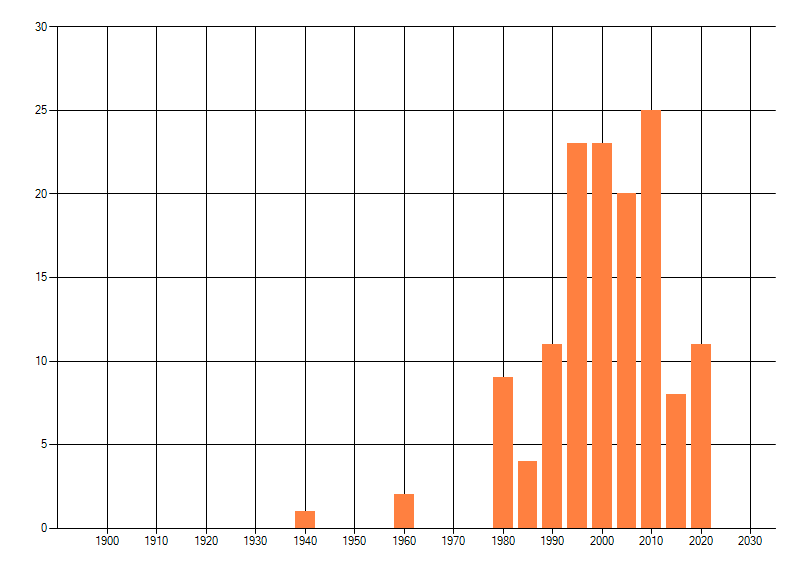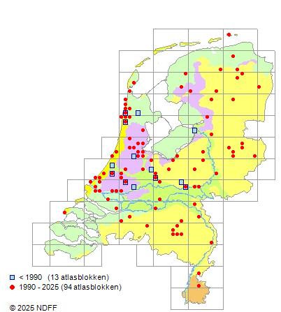 Het aantal atlasblokken (5x5 km) waarin de soort is gemeld binnen een periode van vijf jaar (vanaf 1980) of twintig jaar. Niet gecorrigeerd voor waarnemersinspanning en het aantal doorgegeven waarnemingen kan sterk variëren per periode, dus een trend in verspreiding kan hier niet direct uit worden afgelezen. Het opgegeven jaartal is het eerste jaar van de periode. Bron: gevalideerde waarnemingen uit de NDFF.