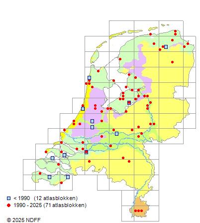 Het aantal atlasblokken (5x5 km) waarin de soort is gemeld binnen een periode van vijf jaar (vanaf 1980) of twintig jaar. Niet gecorrigeerd voor waarnemersinspanning en het aantal doorgegeven waarnemingen kan sterk variëren per periode, dus een trend in verspreiding kan hier niet direct uit worden afgelezen. Het opgegeven jaartal is het eerste jaar van de periode. Bron: gevalideerde waarnemingen uit de NDFF.