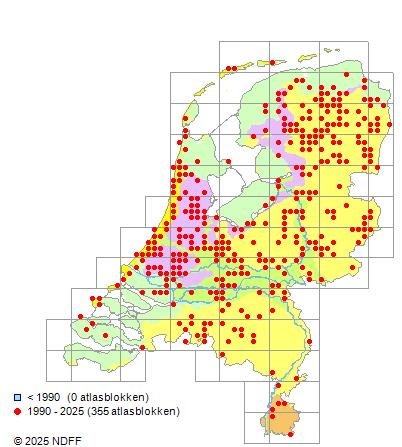 Het aantal atlasblokken (5x5 km) waarin de soort is gemeld binnen een periode van vijf jaar (vanaf 1980) of twintig jaar. Niet gecorrigeerd voor waarnemersinspanning en het aantal doorgegeven waarnemingen kan sterk variëren per periode, dus een trend in verspreiding kan hier niet direct uit worden afgelezen. Het opgegeven jaartal is het eerste jaar van de periode. Bron: gevalideerde waarnemingen uit de NDFF.