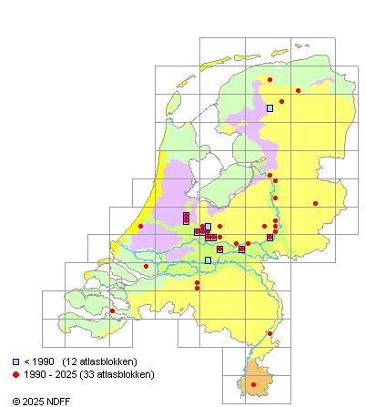 Het aantal atlasblokken (5x5 km) waarin de soort is gemeld binnen een periode van vijf jaar (vanaf 1980) of twintig jaar. Niet gecorrigeerd voor waarnemersinspanning en het aantal doorgegeven waarnemingen kan sterk variëren per periode, dus een trend in verspreiding kan hier niet direct uit worden afgelezen. Het opgegeven jaartal is het eerste jaar van de periode. Bron: gevalideerde waarnemingen uit de NDFF.
