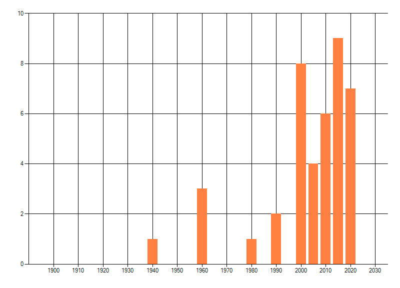 Het aantal atlasblokken (5x5 km) waarin de soort is gemeld binnen een periode van vijf jaar (vanaf 1980) of twintig jaar. Niet gecorrigeerd voor waarnemersinspanning en het aantal doorgegeven waarnemingen kan sterk variëren per periode, dus een trend in verspreiding kan hier niet direct uit worden afgelezen. Het opgegeven jaartal is het eerste jaar van de periode. Bron: gevalideerde waarnemingen uit de NDFF.