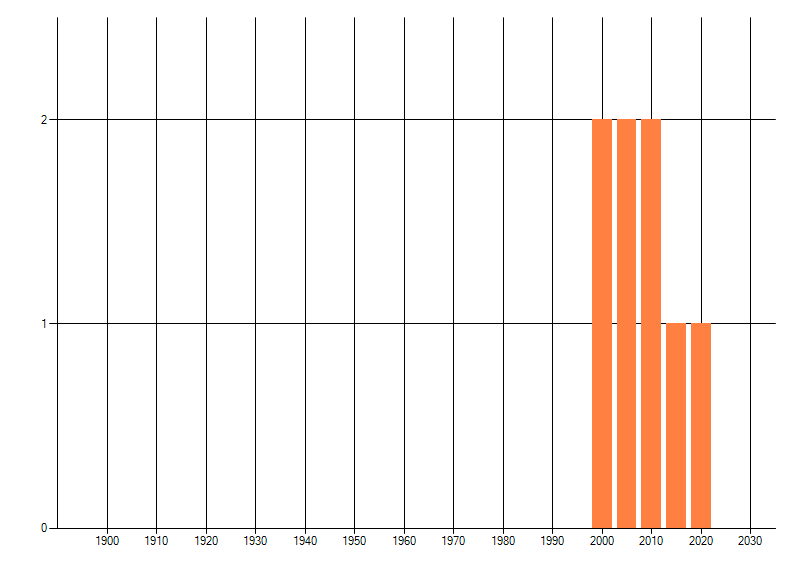 Het aantal atlasblokken (5x5 km) waarin de soort is gemeld binnen een periode van vijf jaar (vanaf 1980) of twintig jaar. Niet gecorrigeerd voor waarnemersinspanning en het aantal doorgegeven waarnemingen kan sterk variëren per periode, dus een trend in verspreiding kan hier niet direct uit worden afgelezen. Het opgegeven jaartal is het eerste jaar van de periode. Bron: gevalideerde waarnemingen uit de NDFF.