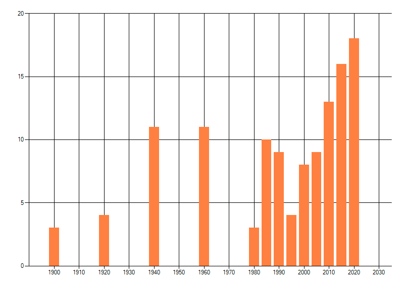 Het aantal atlasblokken (5x5 km) waarin de soort is gemeld binnen een periode van vijf jaar (vanaf 1980) of twintig jaar. Niet gecorrigeerd voor waarnemersinspanning en het aantal doorgegeven waarnemingen kan sterk variëren per periode, dus een trend in verspreiding kan hier niet direct uit worden afgelezen. Het opgegeven jaartal is het eerste jaar van de periode. Bron: gevalideerde waarnemingen uit de NDFF.