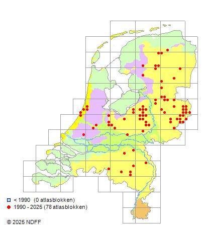 Het aantal atlasblokken (5x5 km) waarin de soort is gemeld binnen een periode van vijf jaar (vanaf 1980) of twintig jaar. Niet gecorrigeerd voor waarnemersinspanning en het aantal doorgegeven waarnemingen kan sterk variëren per periode, dus een trend in verspreiding kan hier niet direct uit worden afgelezen. Het opgegeven jaartal is het eerste jaar van de periode. Bron: gevalideerde waarnemingen uit de NDFF.