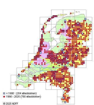 Het aantal atlasblokken (5x5 km) waarin de soort is gemeld binnen een periode van vijf jaar (vanaf 1980) of twintig jaar. Niet gecorrigeerd voor waarnemersinspanning en het aantal doorgegeven waarnemingen kan sterk variëren per periode, dus een trend in verspreiding kan hier niet direct uit worden afgelezen. Het opgegeven jaartal is het eerste jaar van de periode. Bron: gevalideerde waarnemingen uit de NDFF.