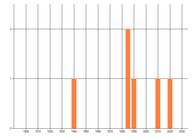Het aantal atlasblokken (5x5 km) waarin de soort is gemeld binnen een periode van vijf jaar (vanaf 1980) of twintig jaar. Niet gecorrigeerd voor waarnemersinspanning en het aantal doorgegeven waarnemingen kan sterk variëren per periode, dus een trend in verspreiding kan hier niet direct uit worden afgelezen. Het opgegeven jaartal is het eerste jaar van de periode. Bron: gevalideerde waarnemingen uit de NDFF.