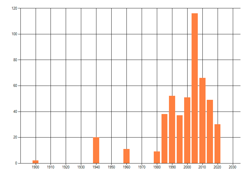 Het aantal atlasblokken (5x5 km) waarin de soort is gemeld binnen een periode van vijf jaar (vanaf 1980) of twintig jaar. Niet gecorrigeerd voor waarnemersinspanning en het aantal doorgegeven waarnemingen kan sterk variëren per periode, dus een trend in verspreiding kan hier niet direct uit worden afgelezen. Het opgegeven jaartal is het eerste jaar van de periode. Bron: gevalideerde waarnemingen uit de NDFF.