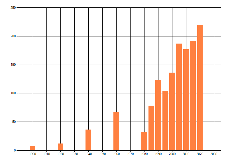 Het aantal atlasblokken (5x5 km) waarin de soort is gemeld binnen een periode van vijf jaar (vanaf 1980) of twintig jaar. Niet gecorrigeerd voor waarnemersinspanning en het aantal doorgegeven waarnemingen kan sterk variëren per periode, dus een trend in verspreiding kan hier niet direct uit worden afgelezen. Het opgegeven jaartal is het eerste jaar van de periode. Bron: gevalideerde waarnemingen uit de NDFF.