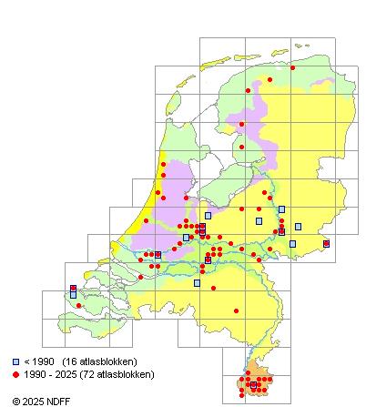 Het aantal atlasblokken (5x5 km) waarin de soort is gemeld binnen een periode van vijf jaar (vanaf 1980) of twintig jaar. Niet gecorrigeerd voor waarnemersinspanning en het aantal doorgegeven waarnemingen kan sterk variëren per periode, dus een trend in verspreiding kan hier niet direct uit worden afgelezen. Het opgegeven jaartal is het eerste jaar van de periode. Bron: gevalideerde waarnemingen uit de NDFF.