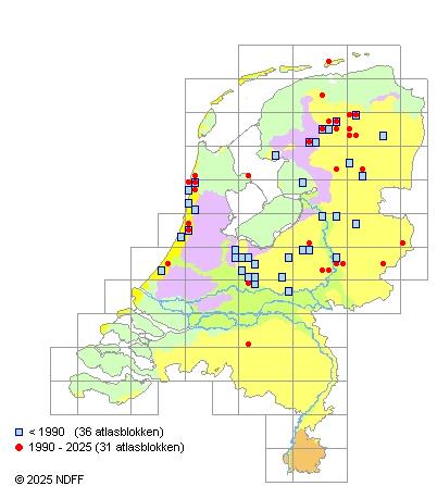 Vroeger vrij zeld., nu zeld., voornamelijk in D, G en R ten noorden van Den Haag; zeer zeld. in S, W en Y. Sterk achteruitgaand. Kaart in Nauta & Vellinga, Atlas. 1995.