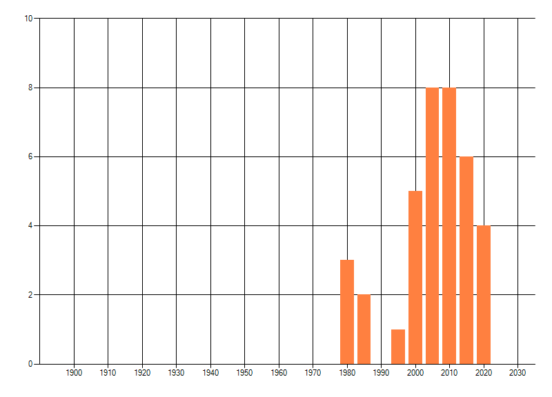 Het aantal atlasblokken (5x5 km) waarin de soort is gemeld binnen een periode van vijf jaar (vanaf 1980) of twintig jaar. Niet gecorrigeerd voor waarnemersinspanning en het aantal doorgegeven waarnemingen kan sterk variëren per periode, dus een trend in verspreiding kan hier niet direct uit worden afgelezen. Het opgegeven jaartal is het eerste jaar van de periode. Bron: gevalideerde waarnemingen uit de NDFF.