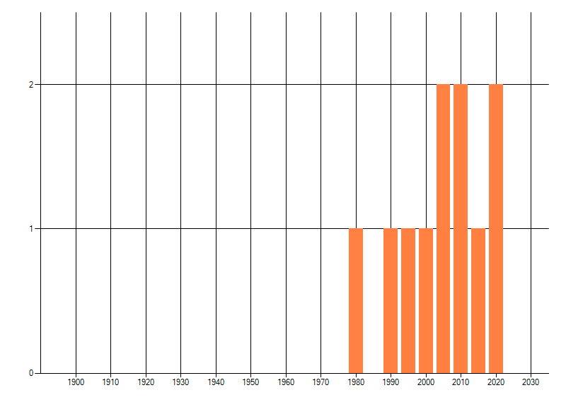 Het aantal atlasblokken (5x5 km) waarin de soort is gemeld binnen een periode van vijf jaar (vanaf 1980) of twintig jaar. Niet gecorrigeerd voor waarnemersinspanning en het aantal doorgegeven waarnemingen kan sterk variëren per periode, dus een trend in verspreiding kan hier niet direct uit worden afgelezen. Het opgegeven jaartal is het eerste jaar van de periode. Bron: gevalideerde waarnemingen uit de NDFF.