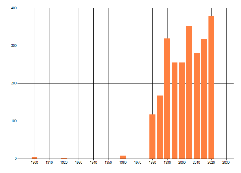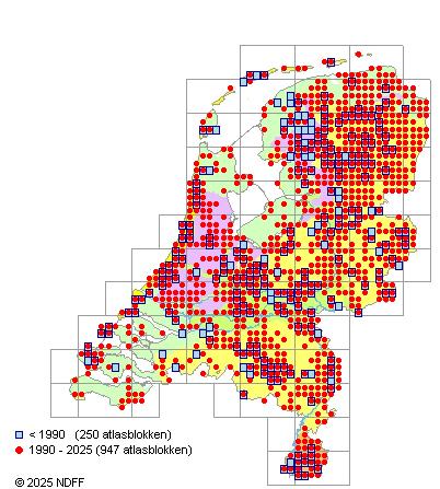 Het aantal atlasblokken (5x5 km) waarin de soort is gemeld binnen een periode van vijf jaar (vanaf 1980) of twintig jaar. Niet gecorrigeerd voor waarnemersinspanning en het aantal doorgegeven waarnemingen kan sterk variëren per periode, dus een trend in verspreiding kan hier niet direct uit worden afgelezen. Het opgegeven jaartal is het eerste jaar van de periode. Bron: gevalideerde waarnemingen uit de NDFF.