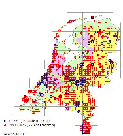 Het aantal atlasblokken (5x5 km) waarin de soort is gemeld binnen een periode van vijf jaar (vanaf 1980) of twintig jaar. Niet gecorrigeerd voor waarnemersinspanning en het aantal doorgegeven waarnemingen kan sterk variëren per periode, dus een trend in verspreiding kan hier niet direct uit worden afgelezen. Het opgegeven jaartal is het eerste jaar van de periode. Bron: gevalideerde waarnemingen uit de NDFF.
